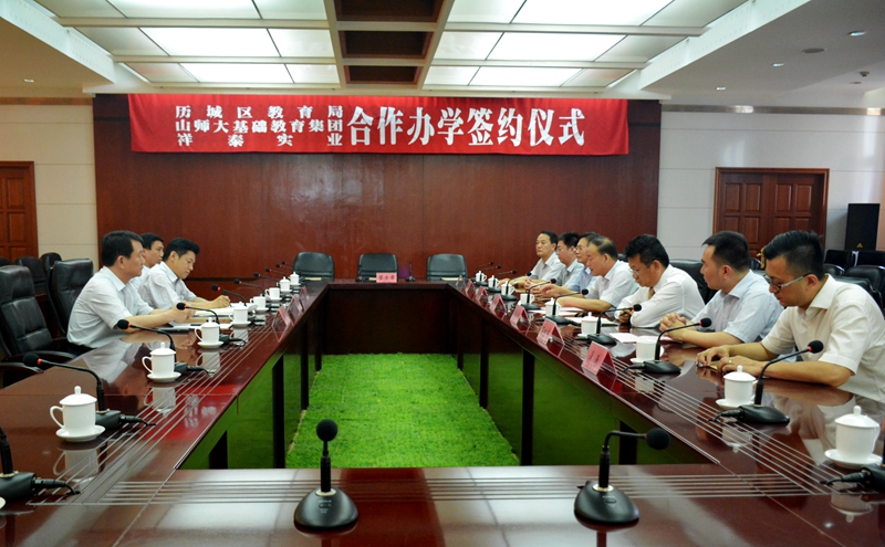 6月12日,山东师大基础教育集团与济南市历城区教育局、祥泰实业有限公司三方合作办学签约仪式在历城区人民政府会议厅隆重举行。山东师范大学党委常委、副校长张文新,山东师大基础教育集团常务副理事长、总经理苗禾鸣,山东师范大学校长办公室副主任肖光军,山东师大基础教育集团副总经理张磊,历城区区委常委、副书记孙德顺,历城区教育局局长庞振福,祥泰实业有限公司董事长于大卫,祥泰实业有限公司祥泰城总经理石继东,祥泰实业有限公司营销总监吴涛等相关代表出席仪式。会议由历城区副区长李金国主持。
