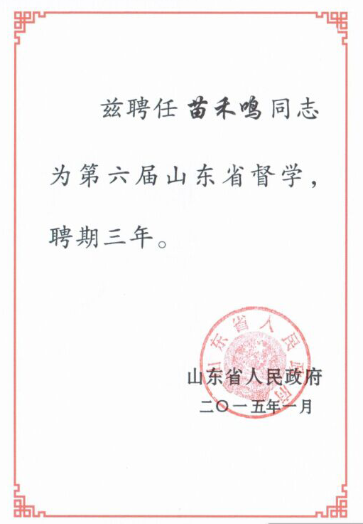 苗禾鸣同志被聘为第六届“山东省督学”