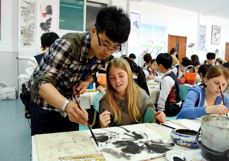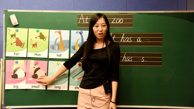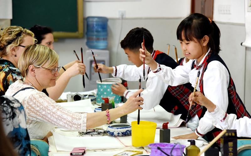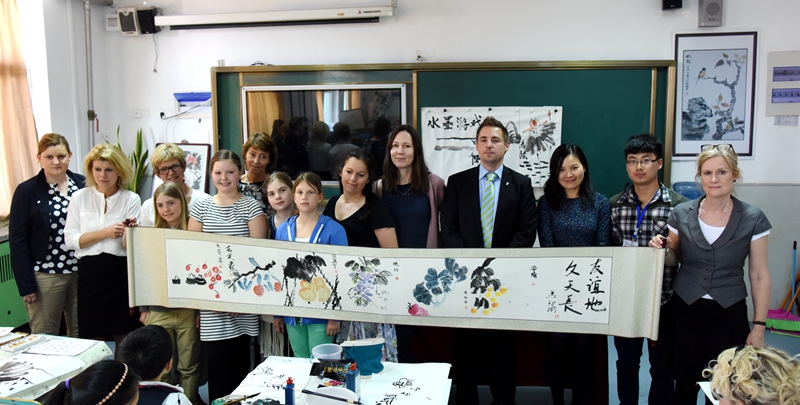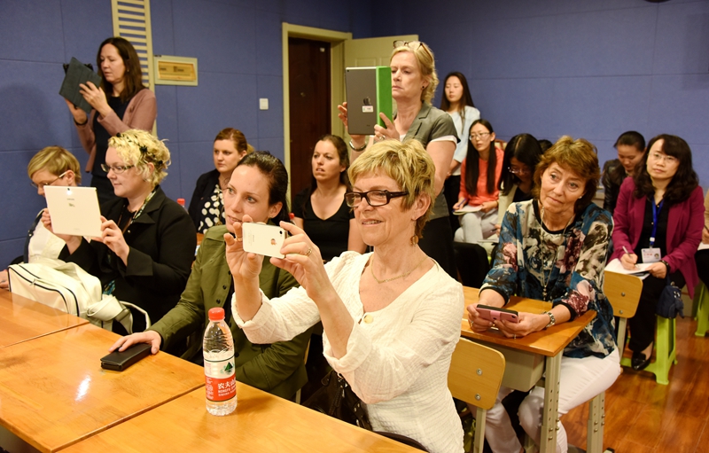 8:30教学交流活动正式开始,第一节课是张传祯老师执教二年级的数学课《周长的认识》,张老师扎实的基本功、严谨的教风让瑞典客人掌声不断。第二节课是英语教师赵东亚的《At zhe Zoo》灵动的课堂、激情的互动,让瑞典客人连连竖起大拇指。随后,就是瑞典访问团Toltorp学校和Krokslätt学校带来的瑞典英语课,她们善于创设生活情境,帮助学生成为学习的主动角色,引起了我校教师的强烈共鸣。最后是马强老师带来的中国传统特色课程《水墨游戏》,访问团拿起毛笔,沾上墨水勾勒出每位瑞典客人心目中的荷花。