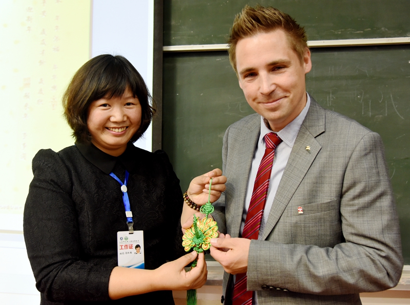 马红梅校长代表雅居园校区将亲手制作的象征吉祥的中国结送给瑞典Toltorp学校校长Martin