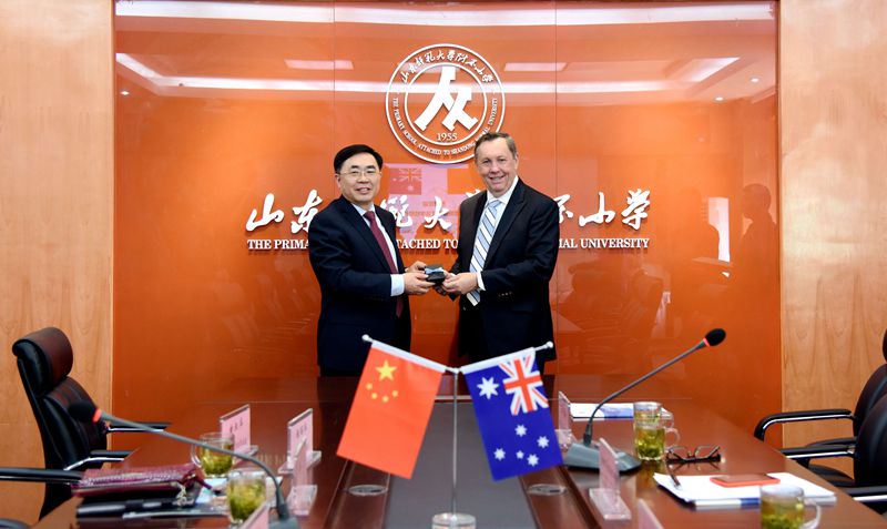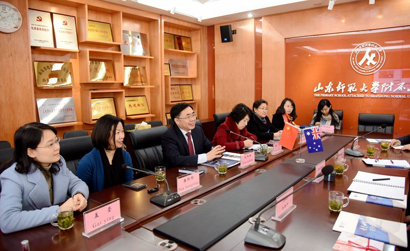 校长、党总支书记刘其彬在学校接待室与来宾进行了愉快的会谈。刘校长详细介绍了我校的办学情况,尤其是国际交流活动的开展情况,刘校长指出,山师附小与克雷菲尔学校自2012年牵手结为友好学校以来,两校已在教育交流方面做了许多工作,取得了丰硕成果,尤其是去年双方首次合作开展的迷你留学活动取得了圆满成功,附小师生从克雷菲尔学校学习到了许多宝贵的经验和做法,他希望有机会能够与伊普斯维奇文法学校(男校、女校)加强沟通与交流,探讨更加深入广阔的合作机会、开辟更多的合作空间。澳洲来宾感谢刘校长热情周到的接待,对附小先进的教育理念、卓越的办学成果,尤其是创建特色课程体系、打造信息化、国际化品牌学校的发展思路给予高度评价,也对彼此的合作充满了信心。同时介绍了伊普斯维奇文法学校(男校、女校)的办学情况,尤其是开展国际教育交流的情况,会谈中,双方还就2015年暑期赴澳洲迷你留学项目的相关问题进行了沟通。