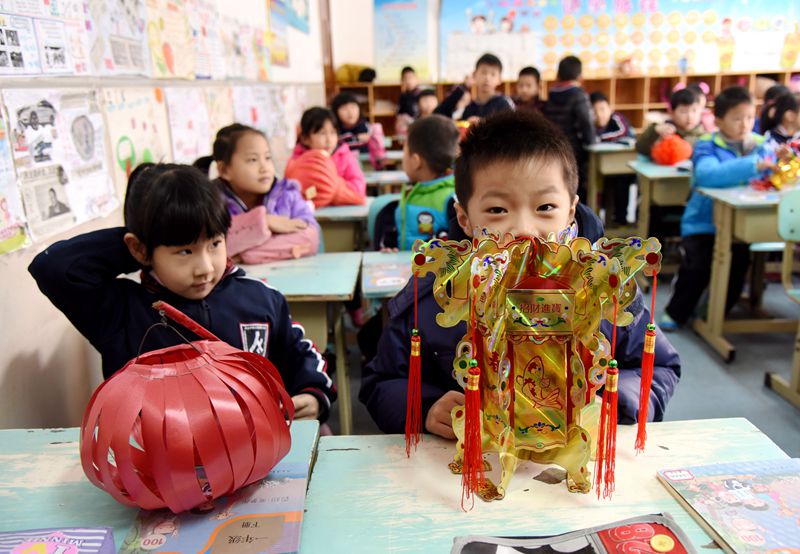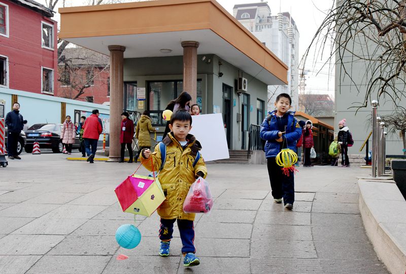同学们带着亲手制作的灯笼兴高采烈的返校