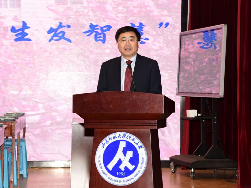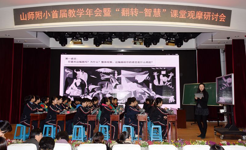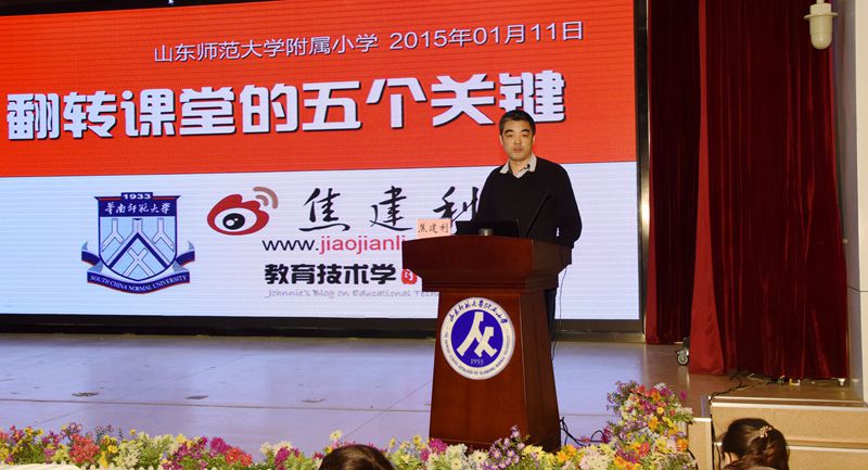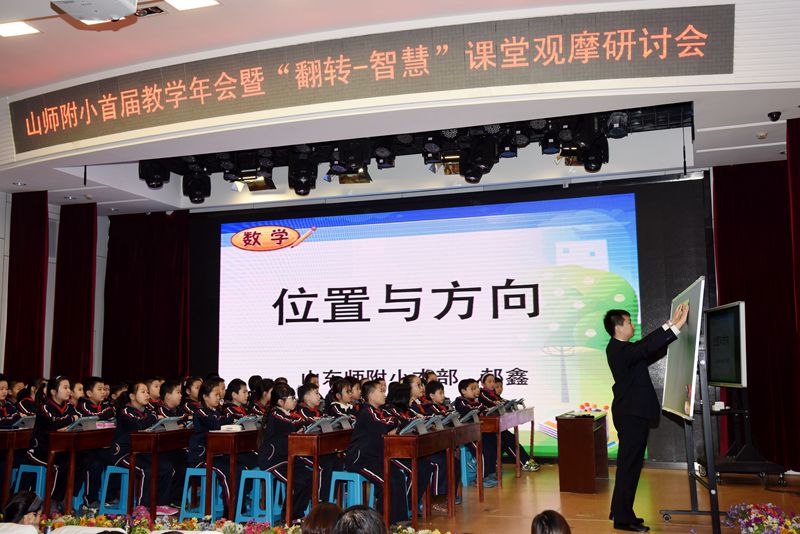 2015年1月11日,山东师大附小教学年会暨“翻转—智慧”课堂观摩研讨会在学术会堂隆重举行。华南师范大学信息技术学院教授焦建利,山东师范大学教育学院教授曾继耘、王红艳,历下区教育局副局长康玉平,历下区慕课中心主任金燕,历下区教科研室主任姜仲平,历下区教研室主任殷崇、副主任谢群,及历下区各学科教研员出席了本次活动。山东师大附小校长、党总支书记刘其彬,副校长、教学管理中心主任刘松,副校长、齐鲁校区执行校长潘恩群,副校长、行政服务中心主任肖宝民,党总支副书记、党群与教育管理中心主任张宁,校长助理、教学研究中心主任刘贵华,校长助理、本部执行校长任丽华等学校领导,东明合作学校的领导教师代表,分校园区校长、教务主任、教师代表,以及本部所有任课教师参加了本次活动。