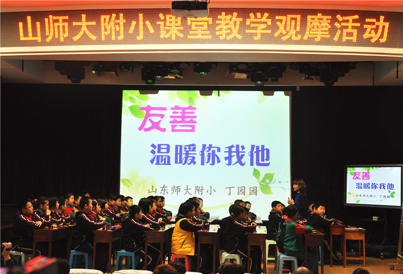 参观团一行首先观摩了郑永老师执教的数学翻转课堂展示课《百分数的认识》和丁园园老师执教的主题班会课《友善温暖你我他》。两位老师精巧的课堂设计、活跃的课堂气氛和良好的课堂效果赢得了大家的一致好评。