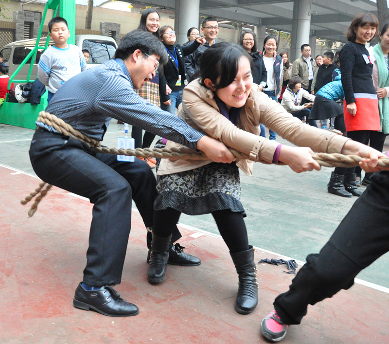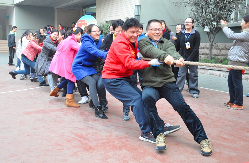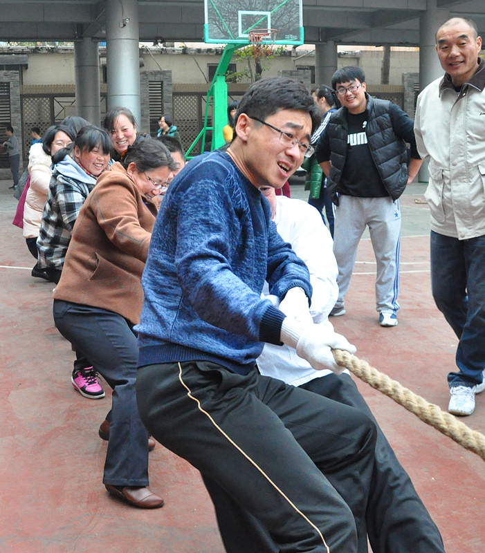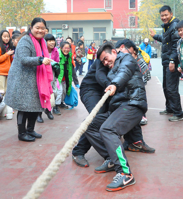 11月21日,拔河比赛在刘其彬校长的哨声中拉开帷幕,老师们在“1—2” “1—2”的加油声中,双手紧握长绳,憋足了劲,拼命往后拉,号子声、呐喊声、加油声,此起彼伏,飘荡在整个赛场上空。拔河比赛共有10支队伍参加,比赛采取三局两胜制,由工会组长抽签决定比赛的组别和对垒队伍,经过耐力与体力的较量,最终有5支代表队获得了胜利。