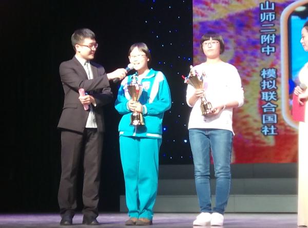济南市第一届社团大赛由济南市教育局团委、济南市教育局体卫艺处、济南教育电视台共同举办。先在各区、县进行初赛,我校模联社通过表演《联合国安理会第7138次会议现场模拟》,在6月12日举办的历下区初赛中以全区第二名的成绩入围复(决)赛,与来自全市12个区、县的52个中小学社团进行了激烈角逐,经过了老师打分、评委打分、观众投票等环节,最终荣获“济南市十佳社团”第一名的好成绩。在颁奖过程中,现场主持人还对社长胡云舒进行了中英双语采访,展示了我校模联社的风采。