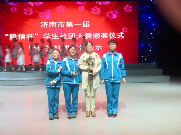 2014年10月24日,我校模联社代表胡云舒、高景鑫、耿一格在团委齐书记的带领下参加了济南市第一届学生社团大赛颁奖仪式,获得了济南市十佳社团中的第一名。