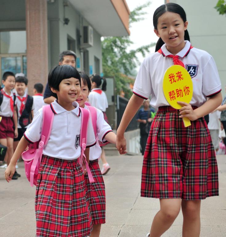“大手拉小手”高年级同学将一年级新生领入校门