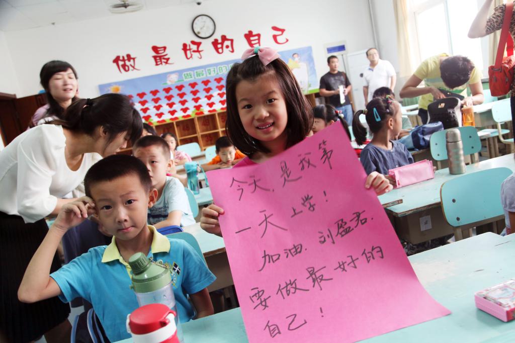一年级的新生刘盈君带着妈妈给写的小纸板来到学校