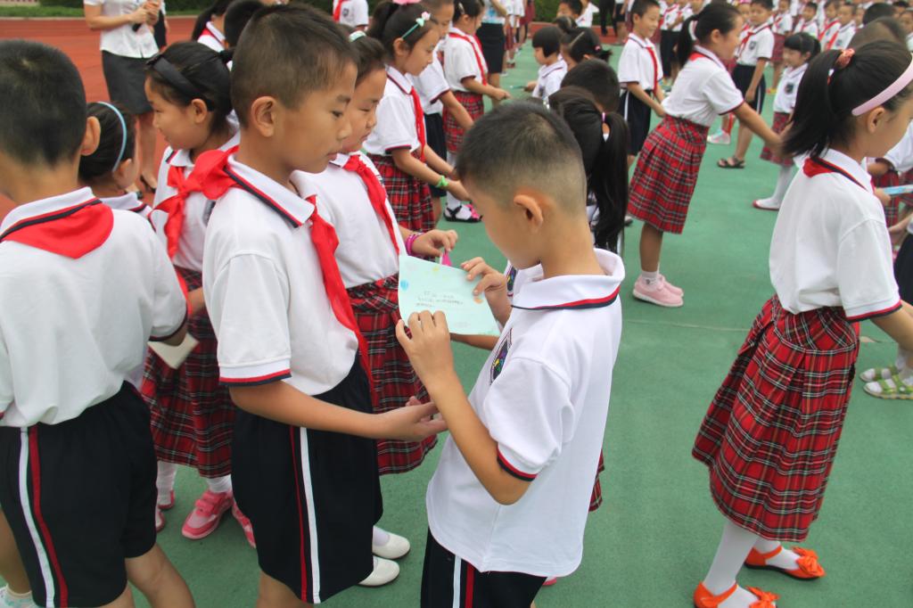 仪式中,四年级的大哥哥大姐姐为刚刚入校的一年级小朋友们送上了自己亲手制作的梦想卡片。小小卡片寄托着大哥哥、大姐姐的美好祝福,放飞着每个新同学梦想的翅膀。来自一一中队的曹绍裳、李迎奥两位小同学代表新生发言,表达了入学的喜悦之情。