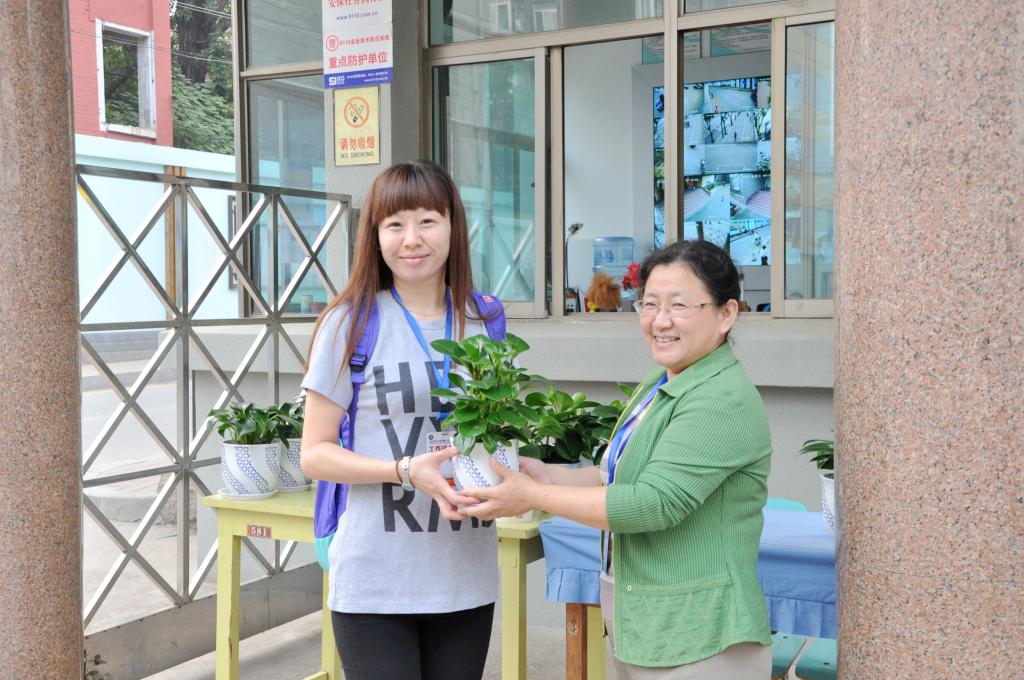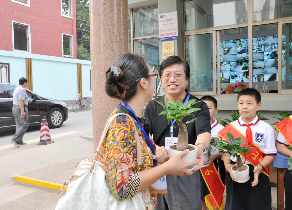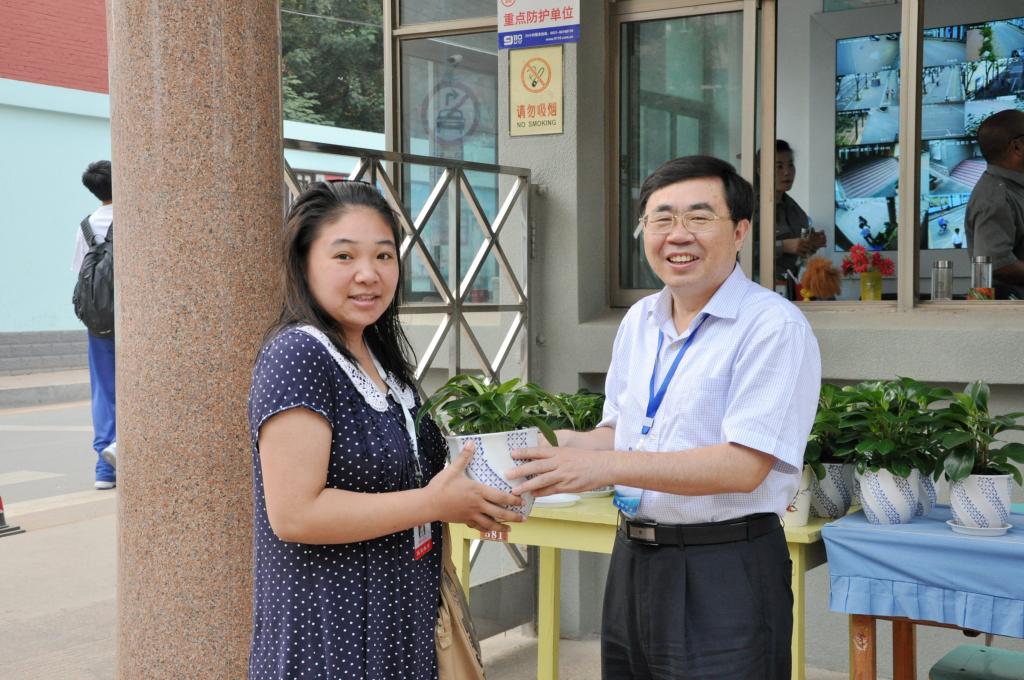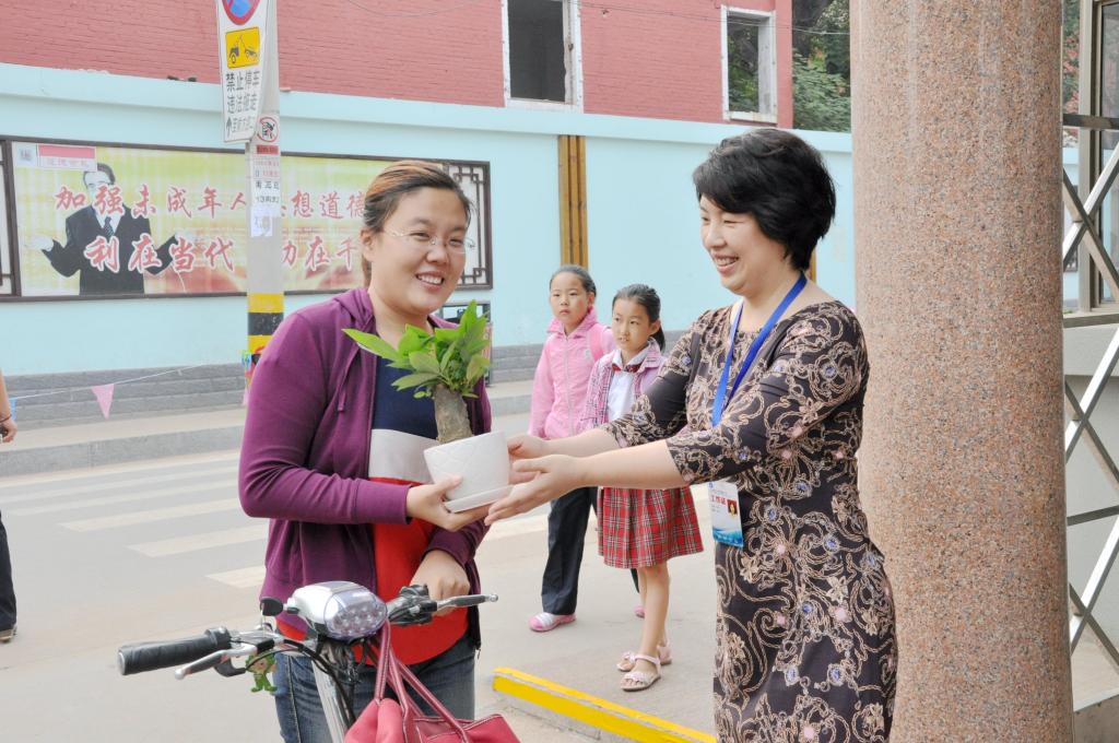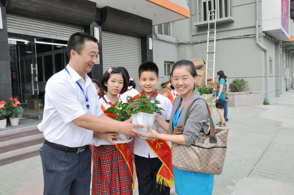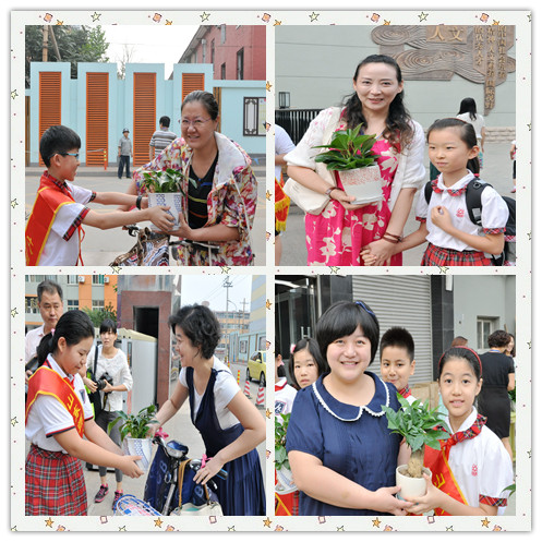 为了改善办公环境、营造和谐工作氛围,在学校工会、妇委会、教育处、大队部的共同策划下,学校为老师们购置了绿色盆栽。教师节的清晨,山东师大附小校长、党总支书记刘其彬、副校长刘松、副校长肖宝民、校长助理张宁、校长助理刘贵华,本部执行校长任丽华等学校领导及少先队员代表手捧绿色盆栽迎接老师们的到来。