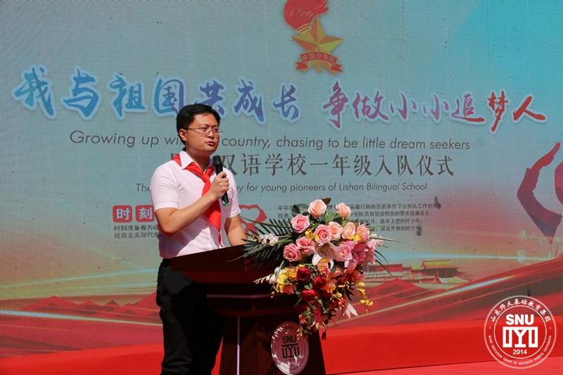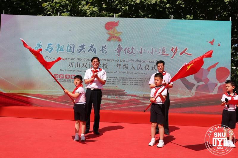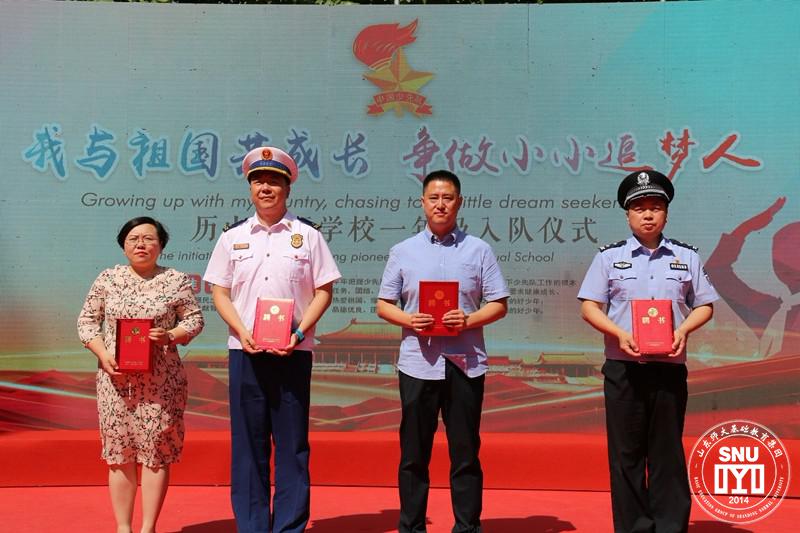 “我是中国少年先锋队员,我在队旗下宣誓……”宣誓声响彻整个校园。六一儿童节到来之际,山东师范大学历山双语学校举行了“我与祖国共成长 争做小小追梦人 ”一年级入队仪式。一年级全体同学在大队辅导员的带领下,宣誓成为少先队员。随后,20余位“神秘嘉宾”为他们佩戴上了人生中第一条红领巾。