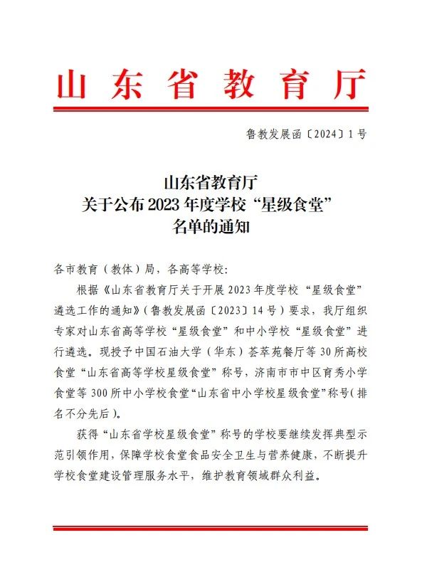 根据《山东省教育厅关于开展 2023 年度学校“星级食堂”遴选工作的通知》(鲁教发展函〔2023〕14 号)要求山东省教育厅组织专家对山东省高等学校“星级食堂”和中小学校“星级食堂”进行遴选。