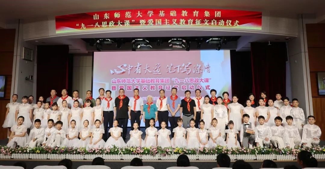 各位嘉宾与学生代表共同按下启动键,伴随着书本缓缓打开,山东师范大学基础教育集团“九一八思政大课”暨爱国主义教育征文活动正式启动。本次活动将面向集团小学、初中、高中所有学子,通过聆听大家思政课,阅读爱国主义题材优秀读物,撰写读后感,以笔墨传扬莘莘学子的爱国之心,献礼伟大祖国。